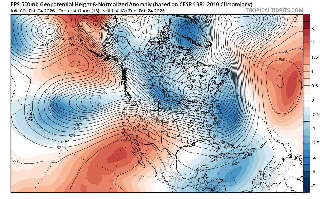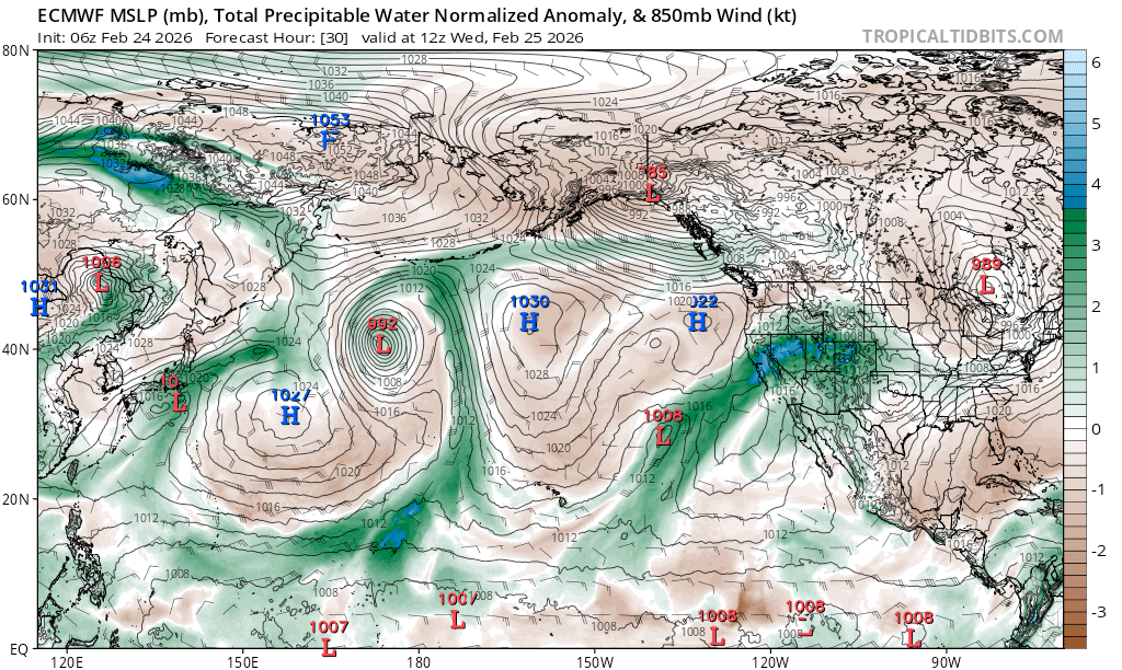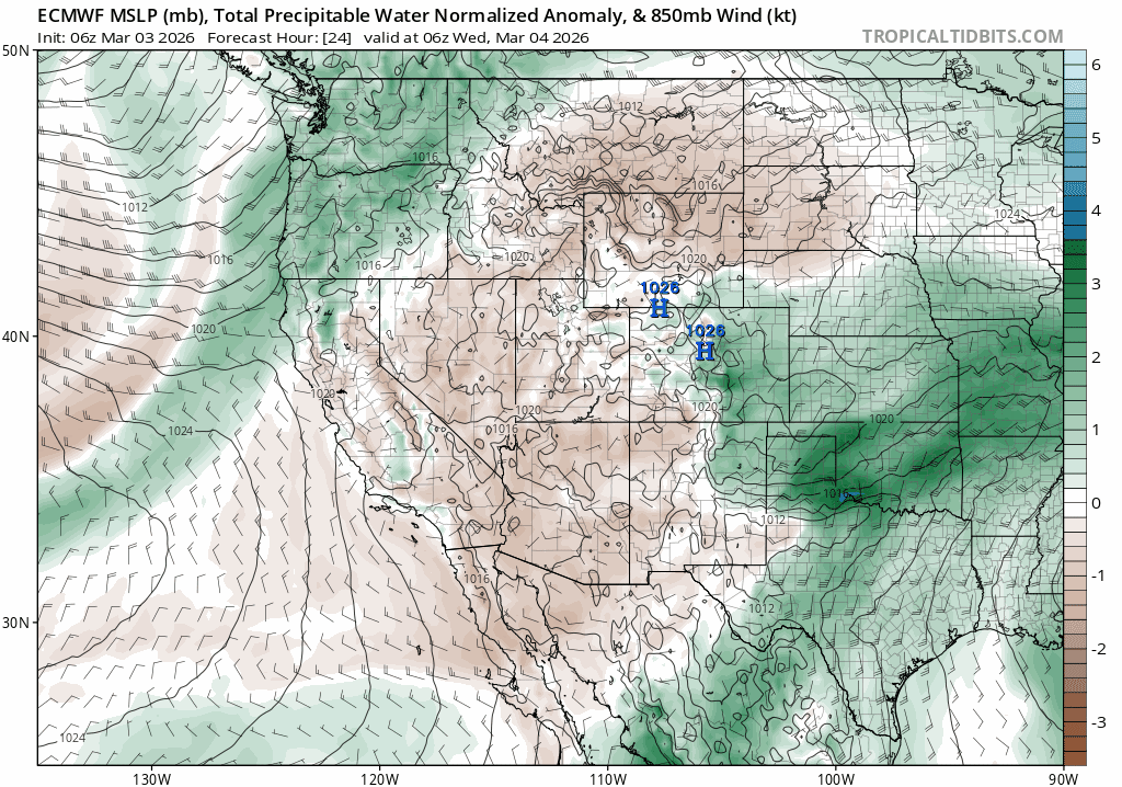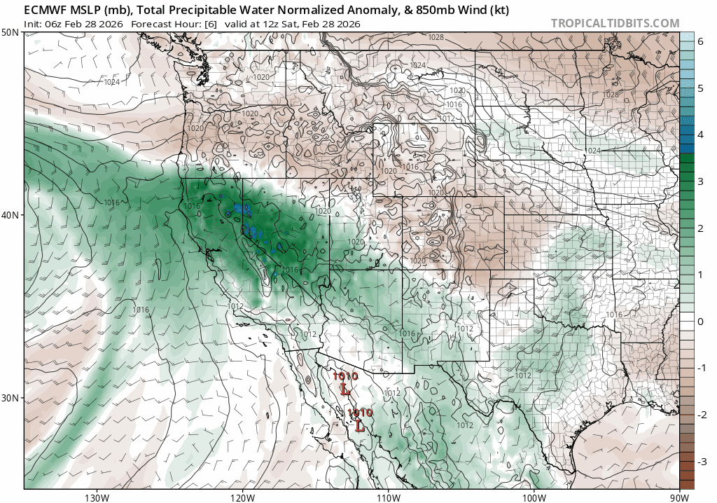 But despite the dynamics, models for the same period consistently show the system starved for moisture, as noted by meager precipitable water anomalies: