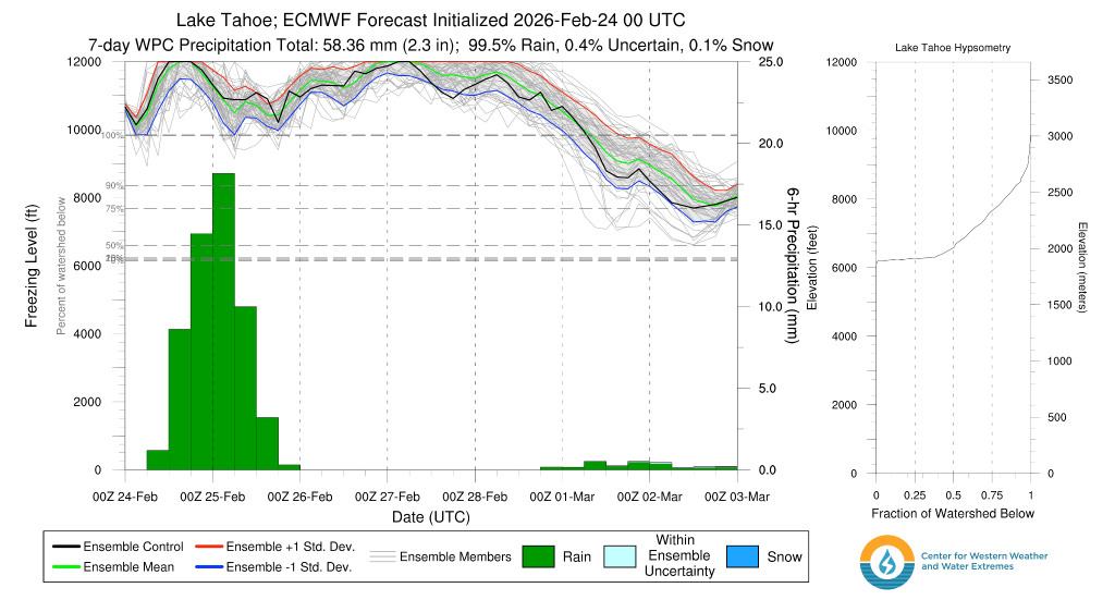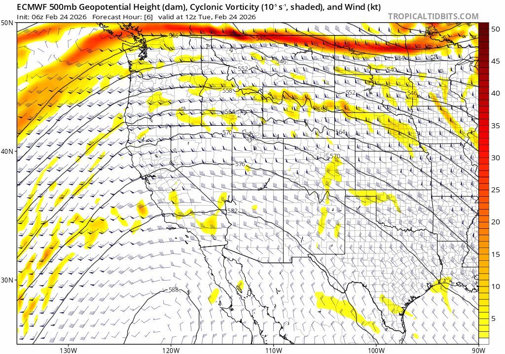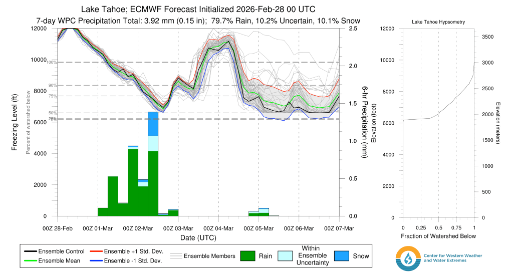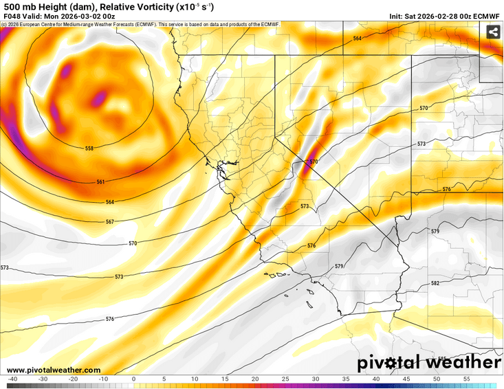 As noted above, tomorrow’s quick hitting system splits off from a trough of low pressure in the PNW, then drops down across the Sierra and Western Great Basin on Weds and early Thurs (3/5 – 3/6). Due to its trajectory in from the NW, the system will be cooler with snow levels around lake level. However, despite middling lifting dynamics and a cooler source region, the system is unlikely to create much impactful precip with total snow amounts between 1-4″ with the highest amounts along the Sierra Crest.