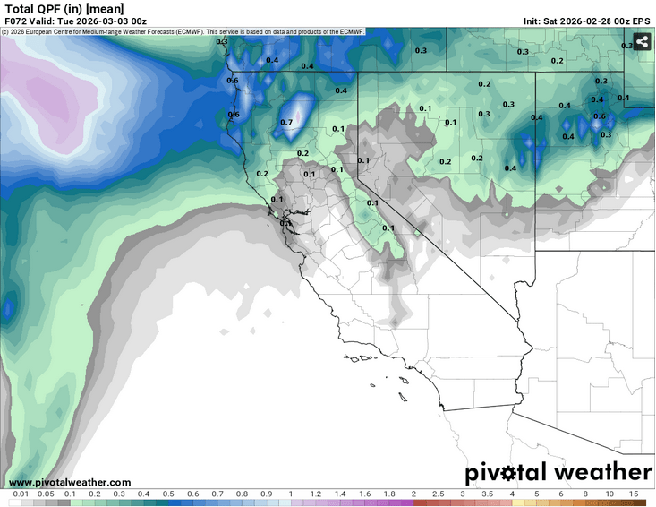 Sun (3/8) into next week, warmth will slowly rebuild as a long wave ridge of high pressure rebuilds over the East Pacific, also blocking any potential storms from rescuing the quickly receding snowpack.