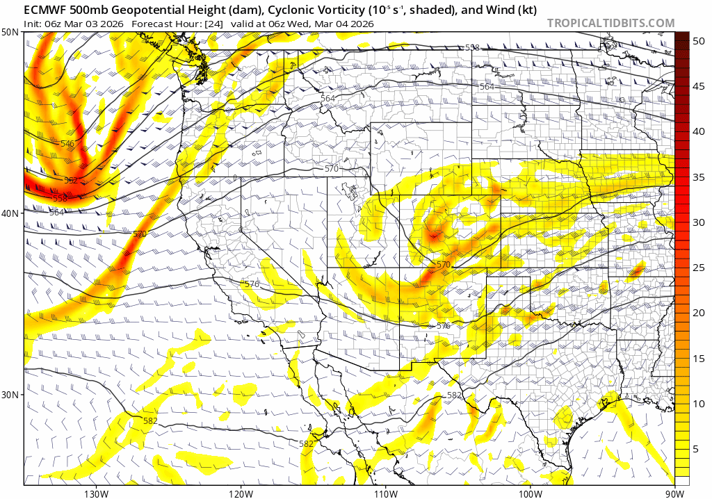 Atmospheric lifting dynamics, as noted by vorticity and 500mb heights through early Fri AM (3/6), do show sufficient lift and instability to create modest rain and snow, especially with the added influence of springtime surface warming on Weds afternoon.
