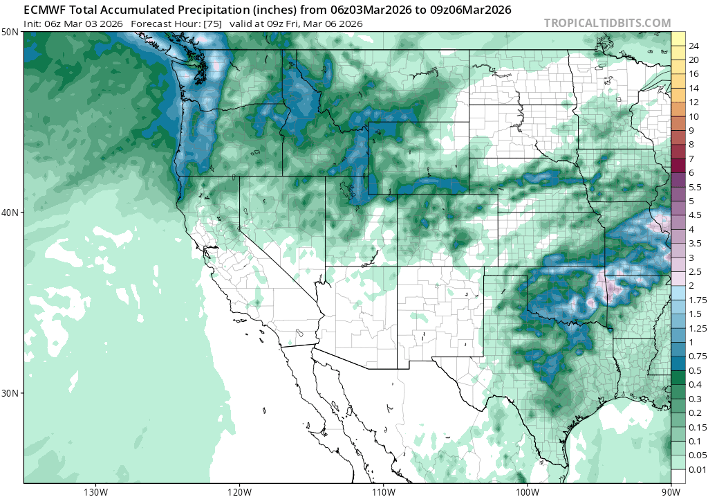 By late Thurs night into Fri (3/5-3/6) total liquid precip. amounts look very light, with only up to .5″ falling near the Sierra Crest.