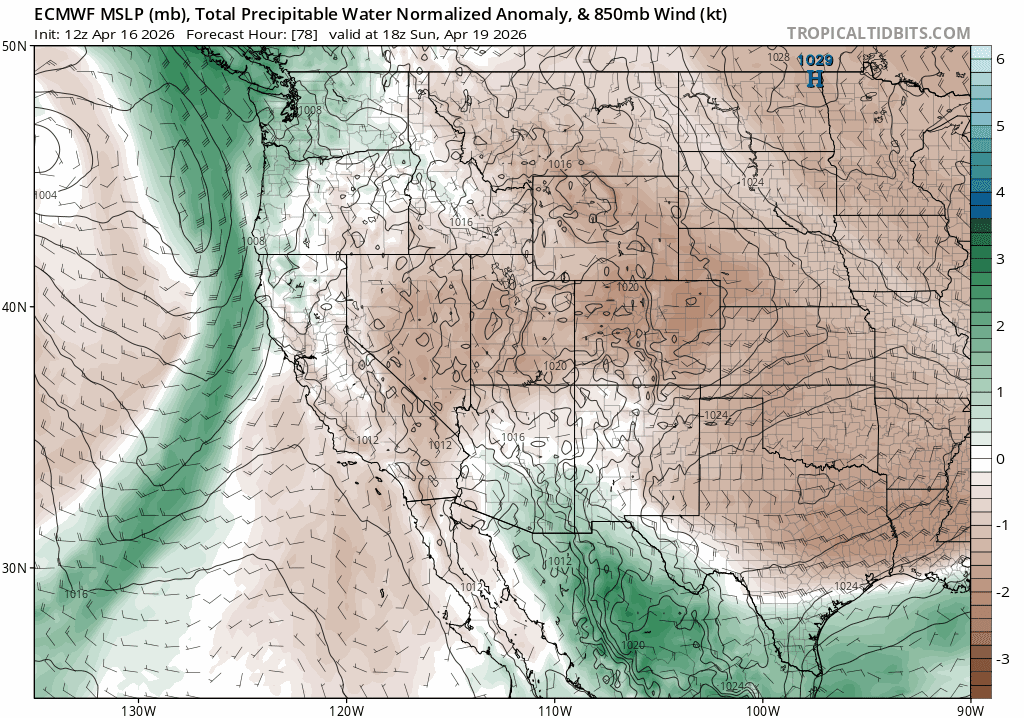 Models also suggest the system will phase with Pacific moisture, creating good chances for rain and snow in the backcountry. Below is the ECMWF forecast total precipitable water (PWAT) anomaly analysis for the same period. (PWAT anomaly shows how much more water than climatologically normal will be in the entire atmospheric column, able to be rained or snowed out.)