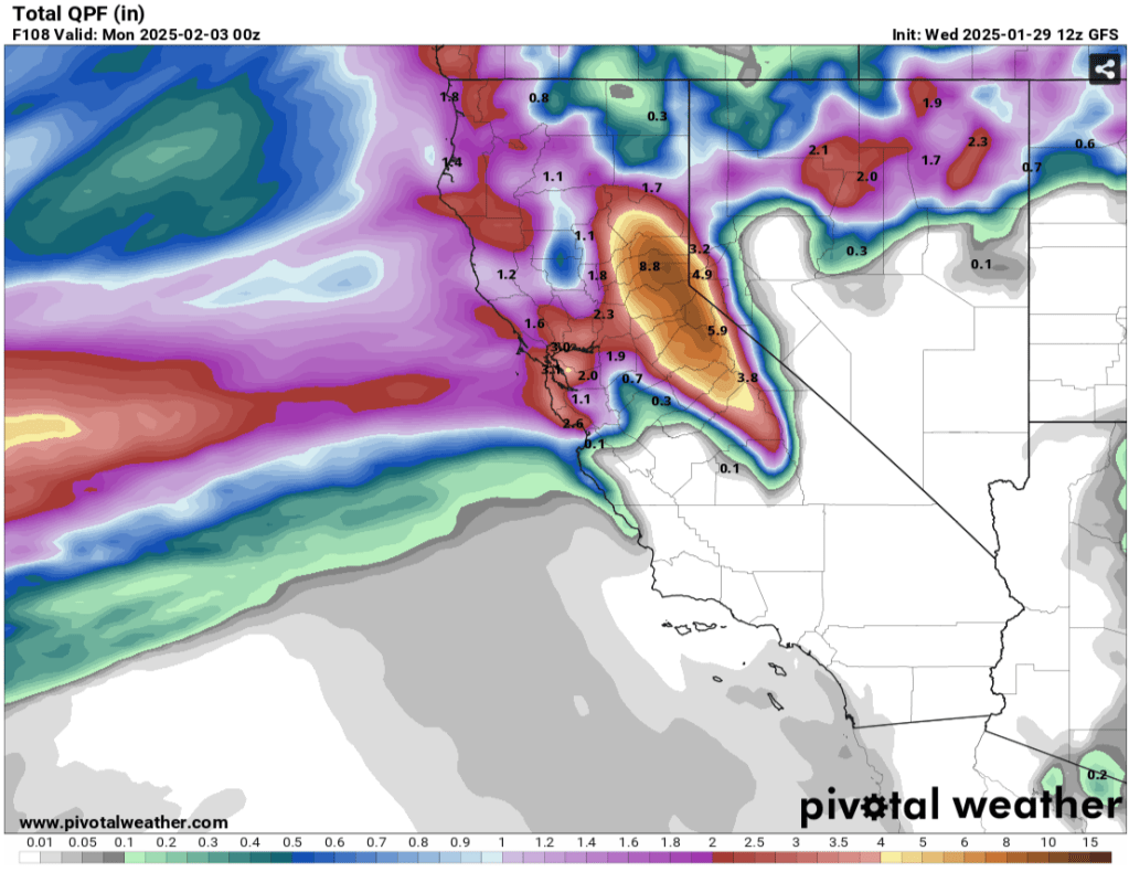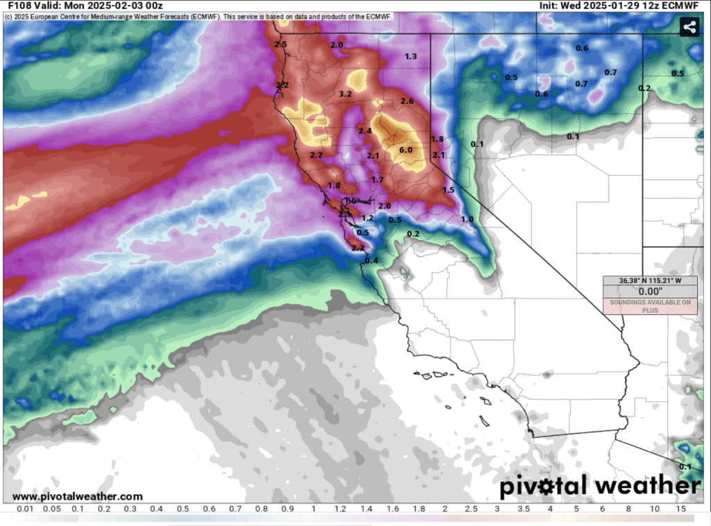 The largest storm cycle of the season to date is right on our doorstep. Heavy precip., high snow levels, and strong SW winds will impact the Tahoe backcountry through the weekend and into Monday. The 50th percentile of models suggests that by Mon. (2/3) several (3+) inches of rain will have fallen below 7000′ in the Tahoe Basin, while 1-3′ of heavy, dense snow is possible, especially above 8500′. Tues. – Thurs., snow levels drop to and below 6000′ as additional rounds of heavy precip. impact the Sierra Mon PM-Tues., and possibly again on Thurs. (2/6).