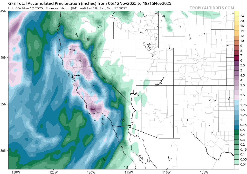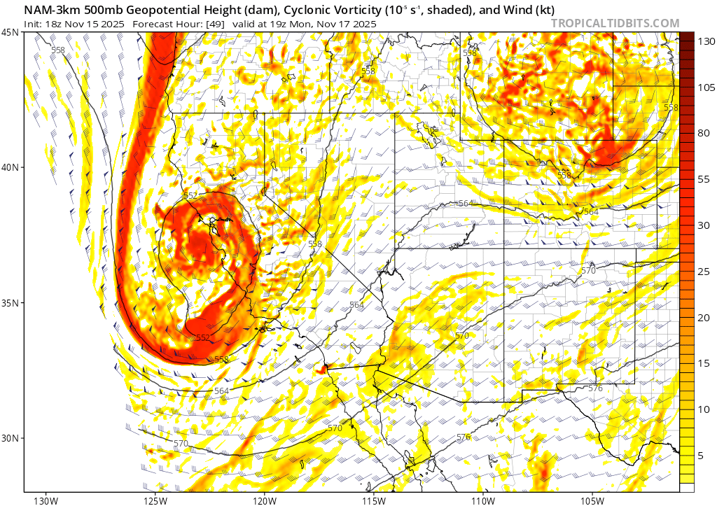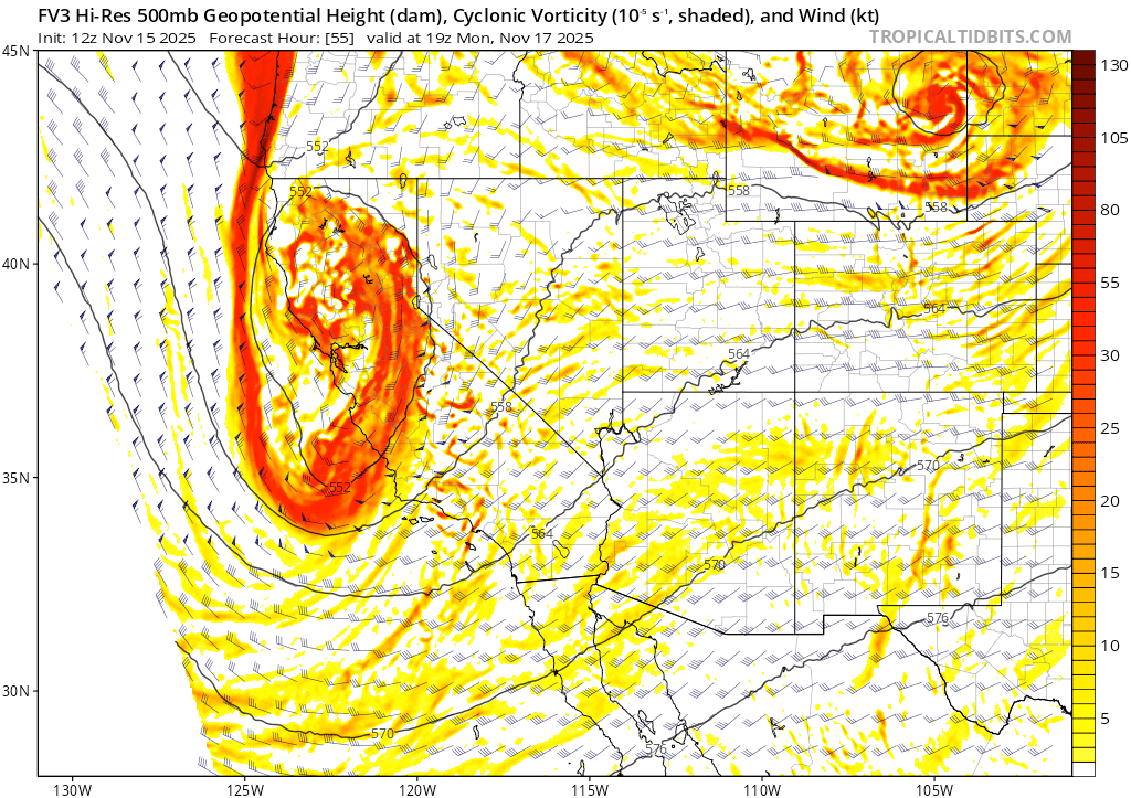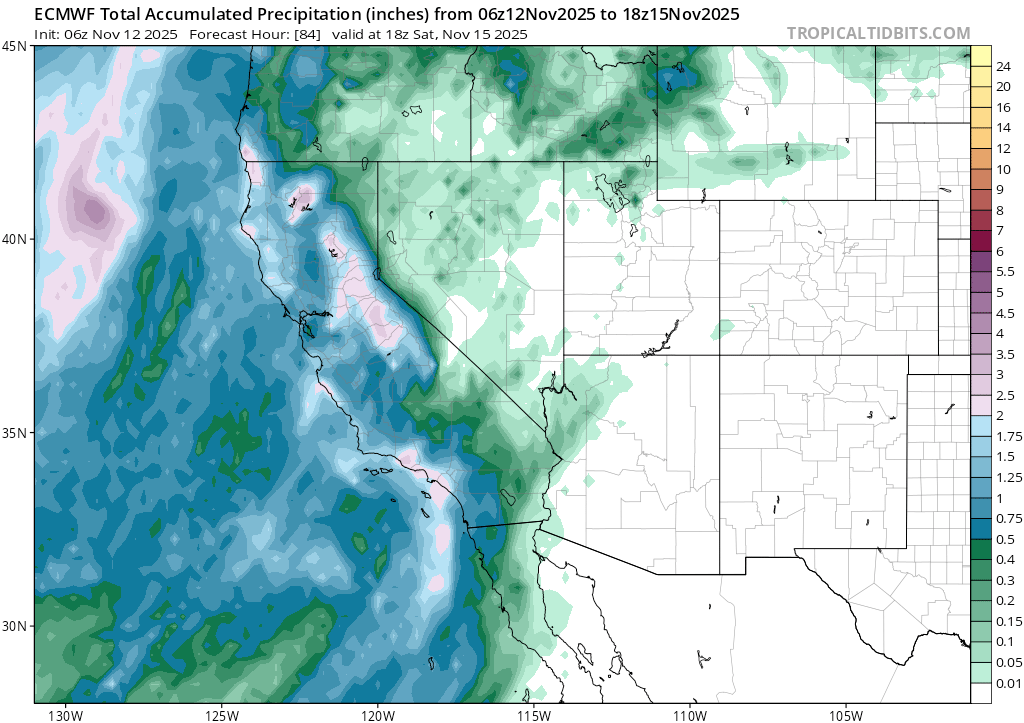 One item to note with this map is the position of the trough over the Great Basin. Setups like this often bring cold storms, but with less abundant precip. The cold air dropping down over land isn’t able to pick up abundant Pacific moisture, so storms tend to have less available juice to work with, but also trend colder. Should this scenario pan out, expect low snow levels (5000′ or lower) and cold, low density snow.