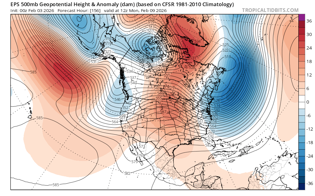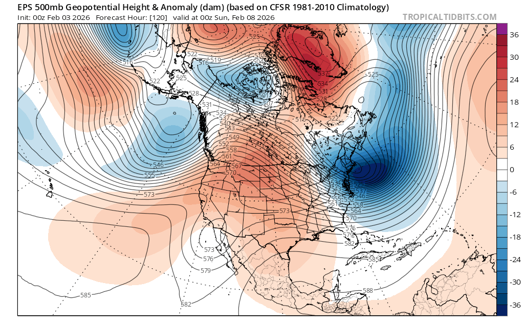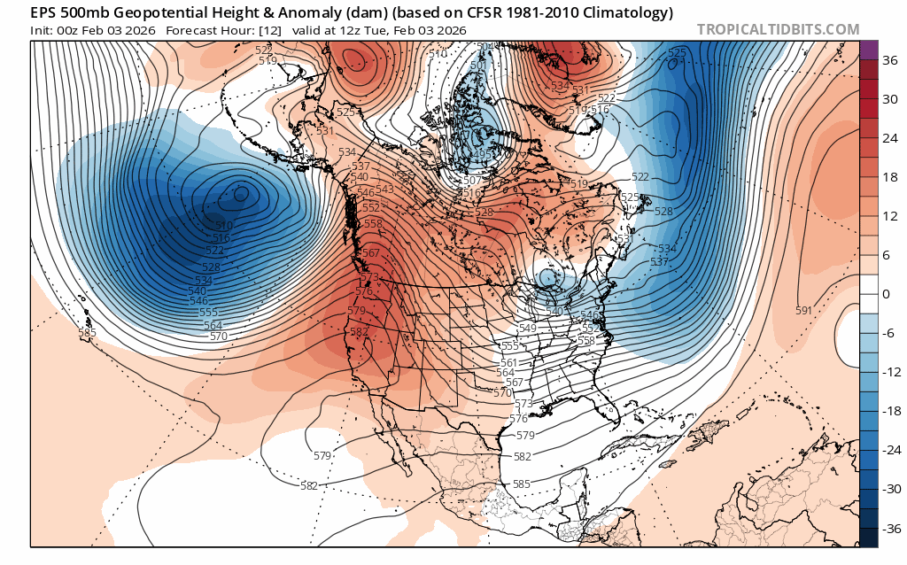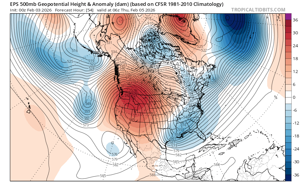The ridge of high pressure (oranges and reds) hangs on across the west early in the week, but by Thurs (2/5), its axis begins leaning back towards the west. (Notice the bend in the black thickness lines.) This is known as a negative tilt, often indicative of weakening. Underneath the ridge, a weak cutoff low begins to form as noted by the closed 576 line off Baja, Mexico.