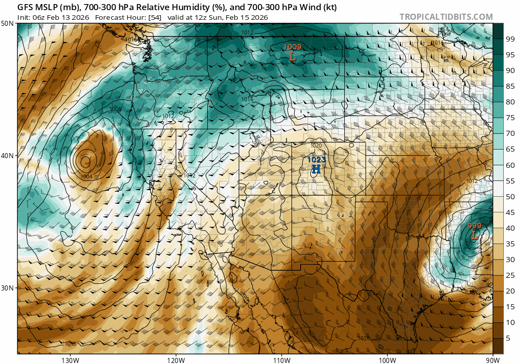 The storms also look to combine low level moisture with the cold air. Models depict the flow of wind traveling down from the north, around the low pressure and across the warm, moisture rich waters off the CA coast. The green shading below translates to mid level relative humidity values.