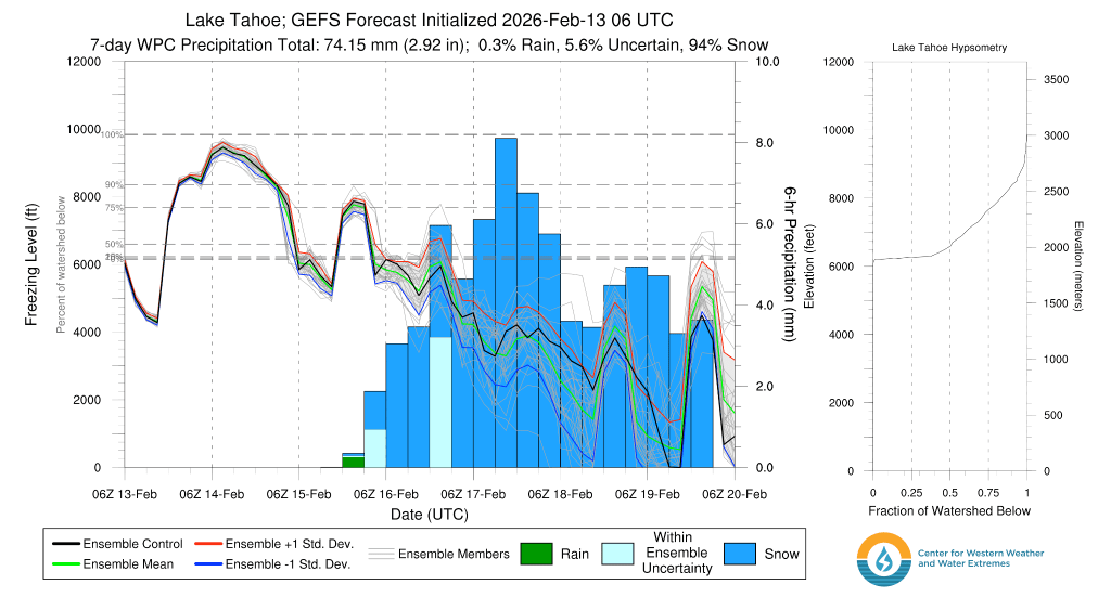Different from the previous storms this season whose fetch of air originated in the subtropical east Pacific, these systems are dropping into the eastern Pacific from the Gulf of Alaska, pulling in copious cold air. GEFS ensembles reflect this with freezing levels starting out below lake level Sunday night as precip starts, then falling and remaining well below 6000′ in the storm.