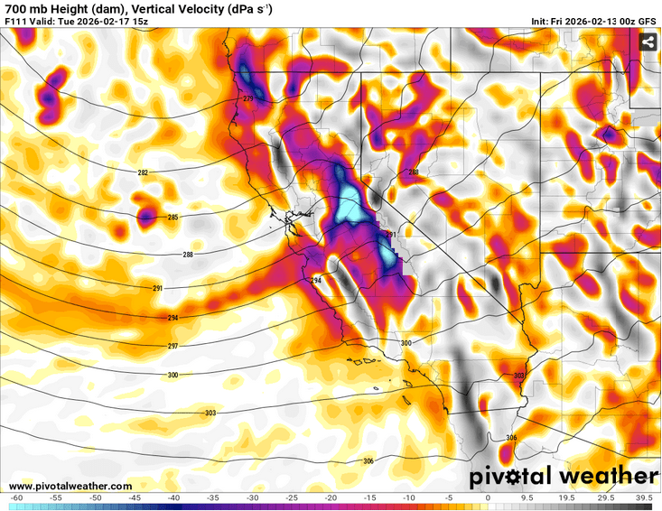 Add this to the upsloping flow off the ocean and into the Sierra, and the air will most certainly rise, as noted in this image of vertical air velocity in the low-mid levels for Tues (2/17) around 0700 PST.
