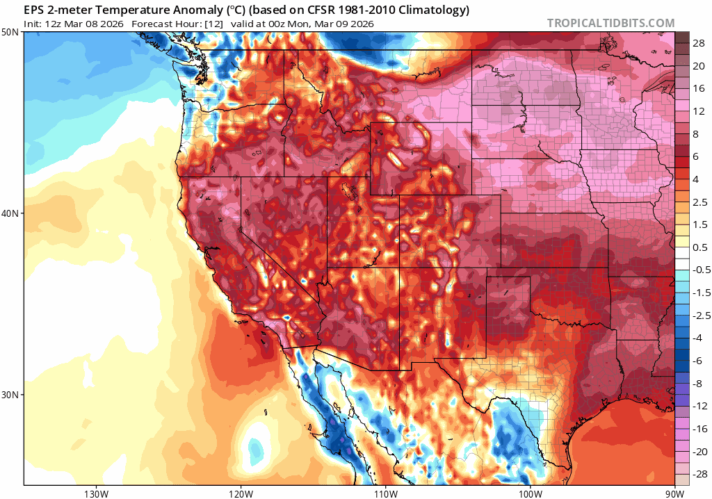 Well above average temps and dry weather will dominate the coming week (3/9-3/15), further hastening the demise of the 2026 snowpack. Highs look to reach the upper 40s to low-mid 50s above 7000′, especially around midweek and into the coming weekend. Inversions return each night with lows in valleys and depressions dropping to near or just below freezing, while upper elevations remain well above freezing. Upper elevation snow surfaces should refreeze through midweek due to evaporational cooling in the drier, high elevation air. Warmer air arrives towards the end of the week likely signaling weaker refreezes, if at all.