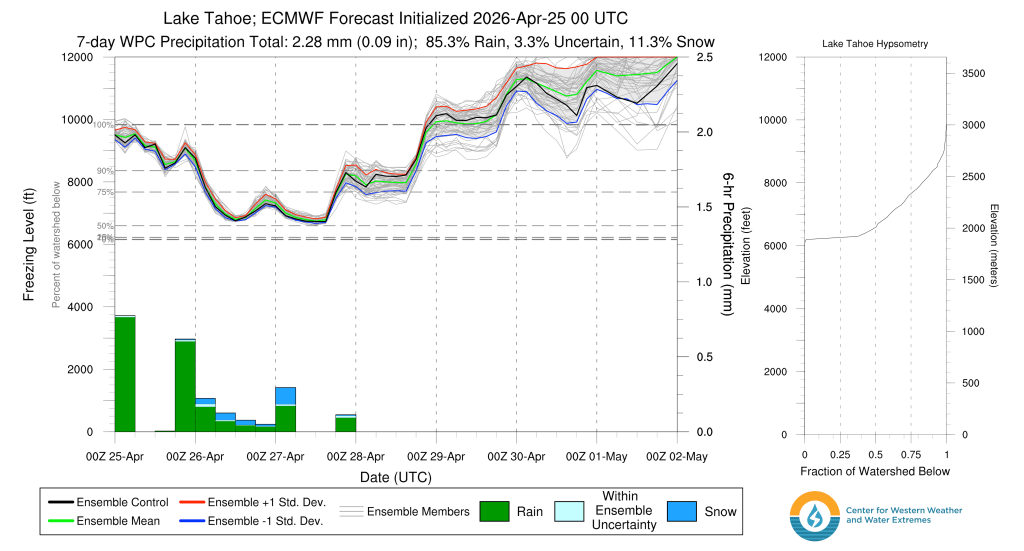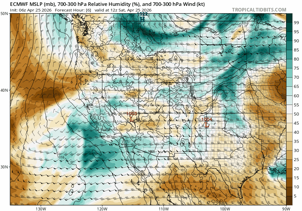 In addition to the dynamics, there’s also plenty of moisture across the Sierra to condense out into precip. as noted in the Euro model for mid level relative humidity levels from this weekend through Mon (4/27). Notice the slug of moisture south of Tahoe late Sat into early Sun.