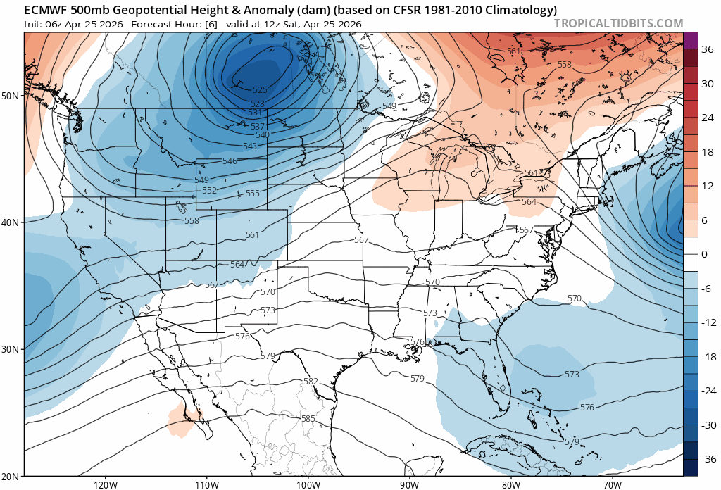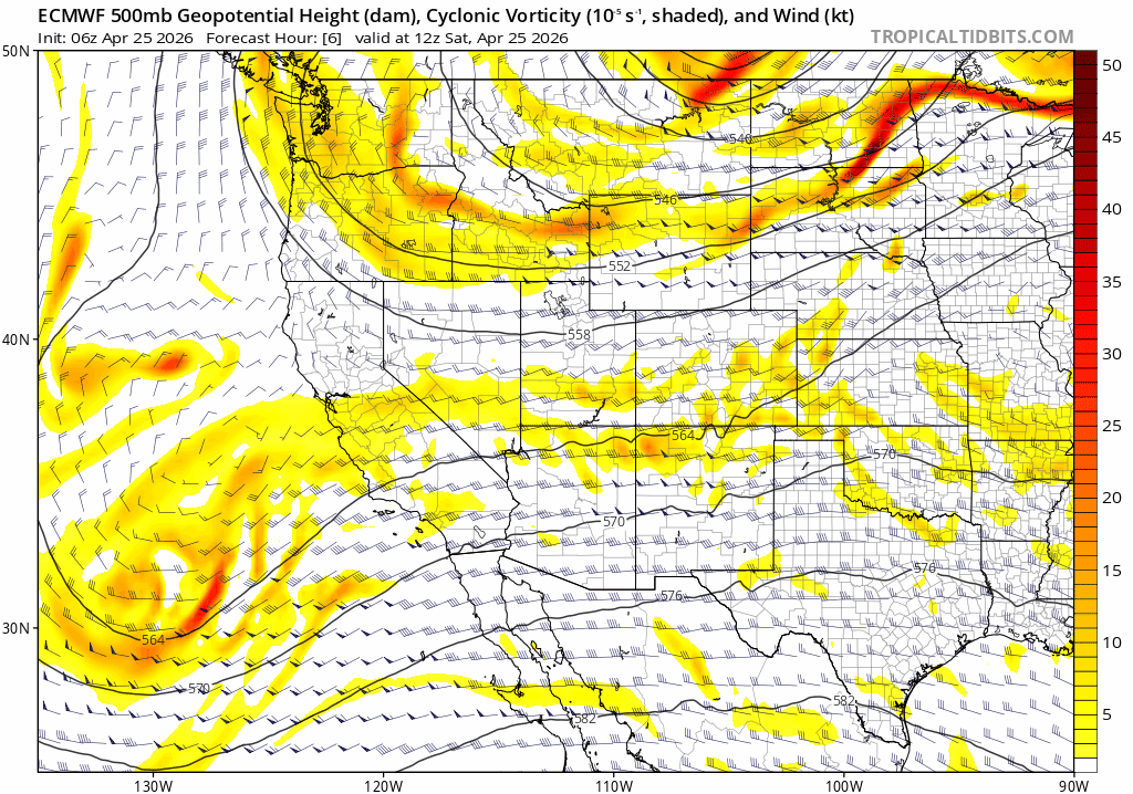 The culprits behind this unsettled and complicated pattern of late day showers and storms are two areas of troughing in the upper atmosphere and their associated pulses of low pressure: one to the NE and another low coming ashore on the central CA coast that eventually merge late Sat into Sun (4/25-4/26) before meandering off to the east.