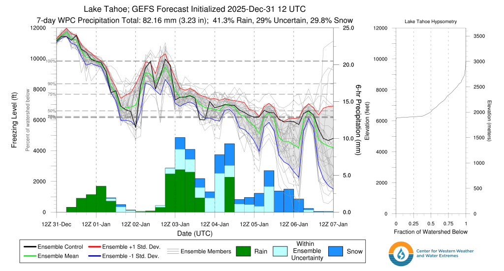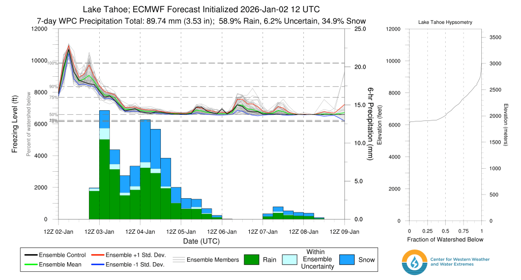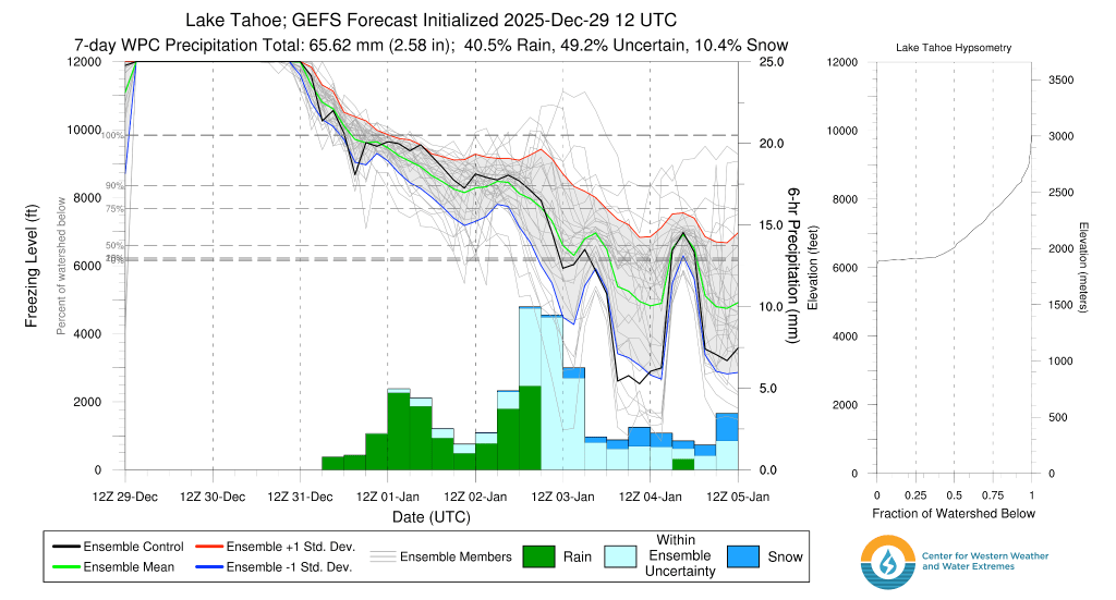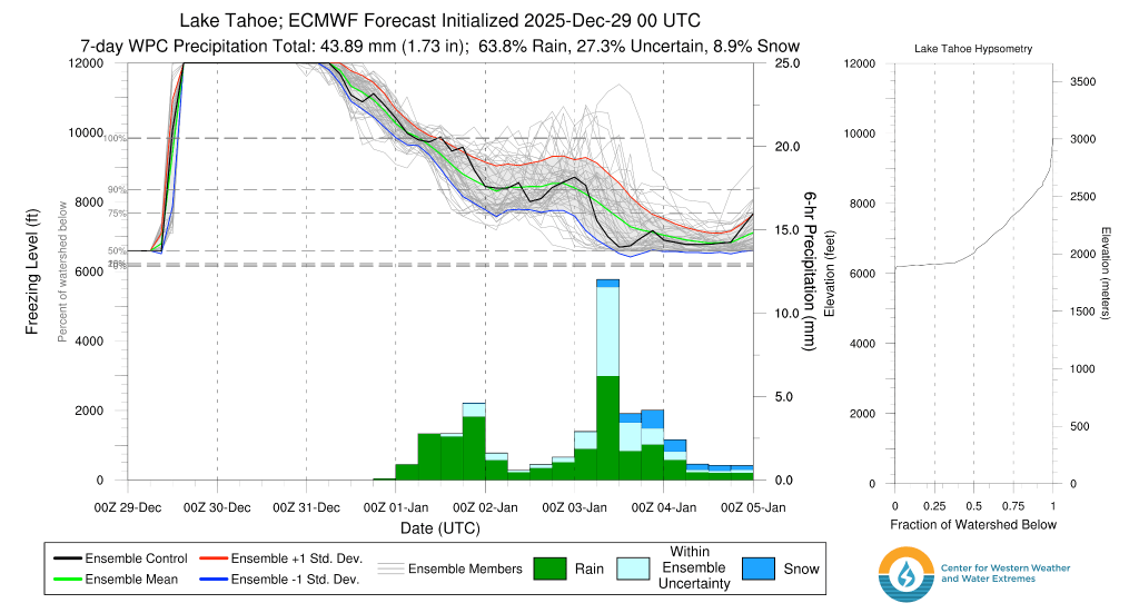 Much like previous storms this year, precip. will initially start as rain on Sat. morning as high as 7500′-8000′ before transitioning to snow throughout the day as snow levels quickly crash. By late Sat., snow levels will likely be at or just above lake level and slowly falling throughout the evening, bringing accumulating snows back to Tahoe communities through late on Mon (1/5). Much like the Christmas storm, temps may struggle to drop below freezing at lake level until colder air arrives with round 2 on Sun. However, it’ll be all snow for the backcountry above 7000′.