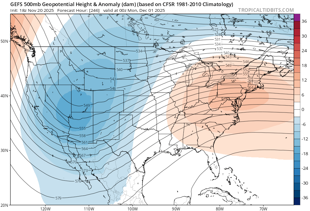 In short, a ridge-busting signal into a cool and wet pattern bringing snow has yet to emerge in the long term forecasts going out towards Christmas. Keep on enjoying the climbing/running/biking/etc.
