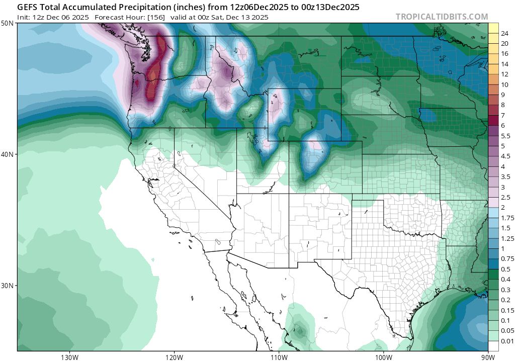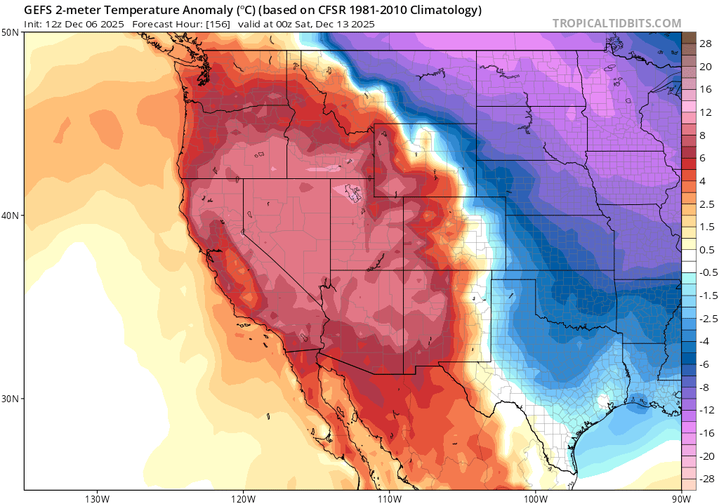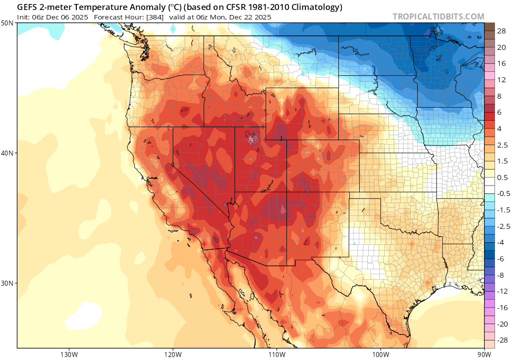 The current warm and dry pattern will continue for the foreseeable future. Through the coming week, the dominant ridge of high pressure over the eastern Pacific will hold strong, blocking storms from reaching CA and sending disturbances into the PacNW. Through Friday (12/12) model ensembles keep the Sierra warm and bone dry.