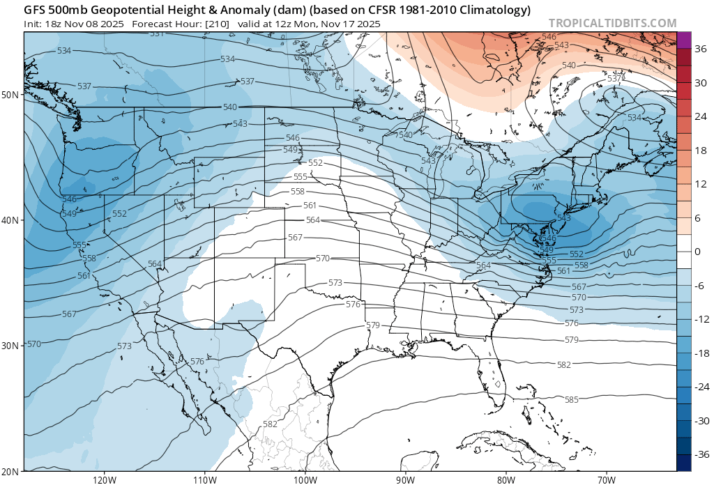 Monday (11/17) another storm enters the picture that models suggest will be colder than the 11/13-14 and 11/16 rounds of rain/snow. Like the most recent storm, Monday’s storm will be a wobbly cutoff low, notoriously tricky to forecast. As of late Sat, the thinking is that this storm will bring mainly snow to the Sierra above 6000′-6500′ during the day on Mon. Additional accumulations of up to a foot could fall in the higher zones of the Mt. Rose area and especially along the Crest above 8000′.